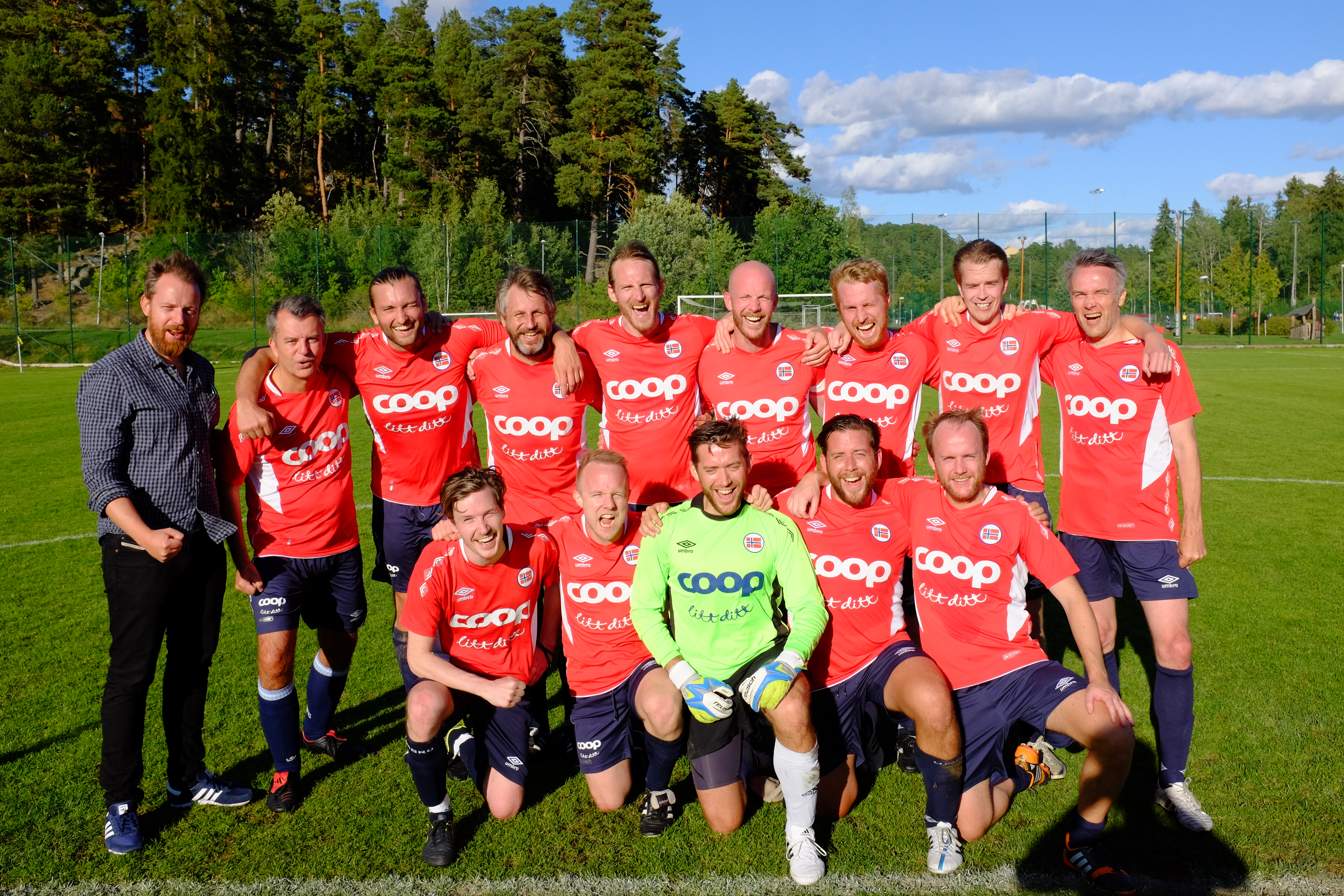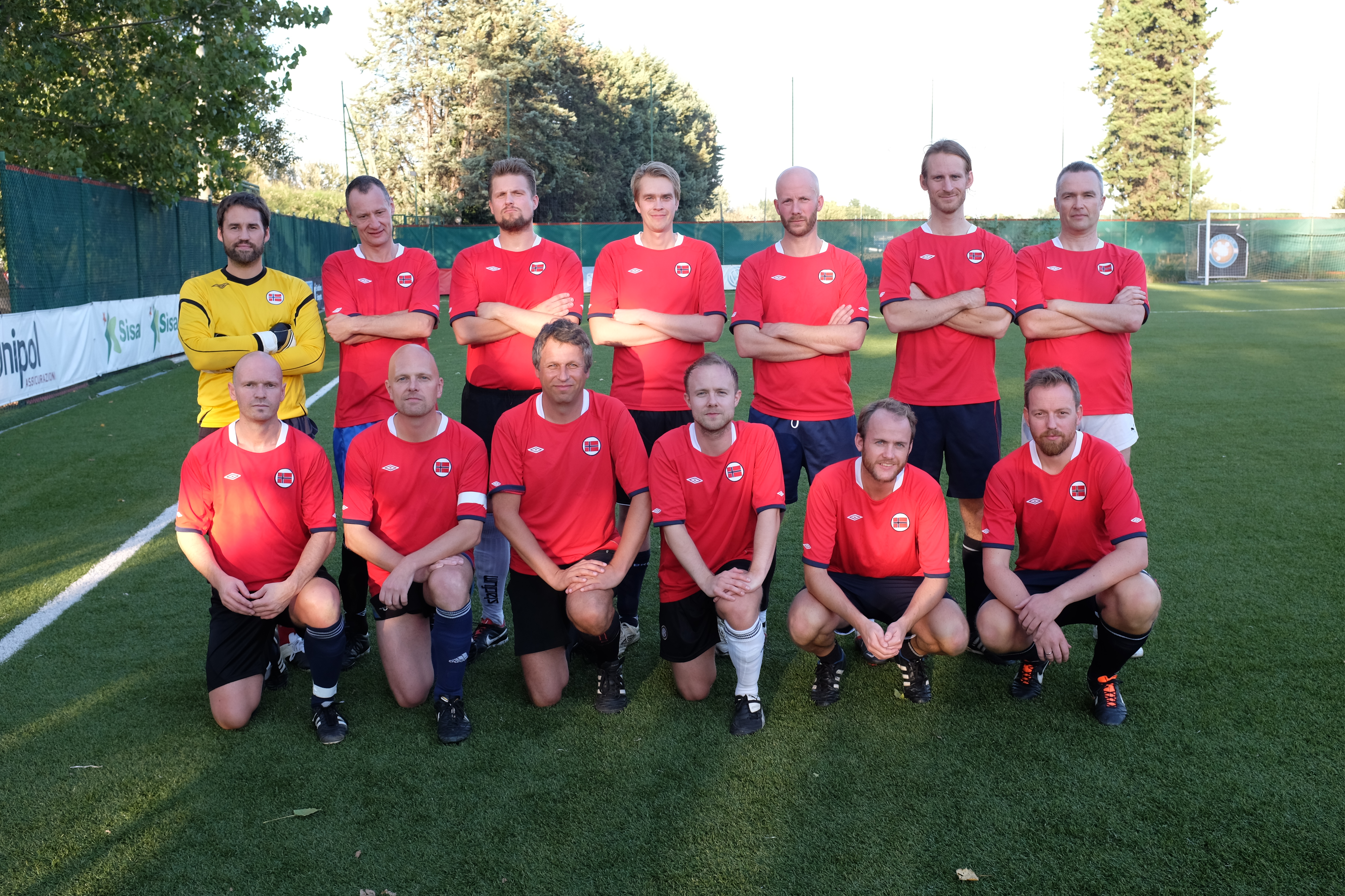 England – Norge 2018. Helt bakerst f.v. forvirra engelskmann. Bak f.v. Thomas Espevik, Eirik Ingebrigtsen, Peder Samdal, Anders Bache, Martin, Halvard Raavand og Bendik Ødegaard. Foran f.v. Rick, Jo Sannem, Lars Ravaand, Audun Mortensen og Marius Molaug.