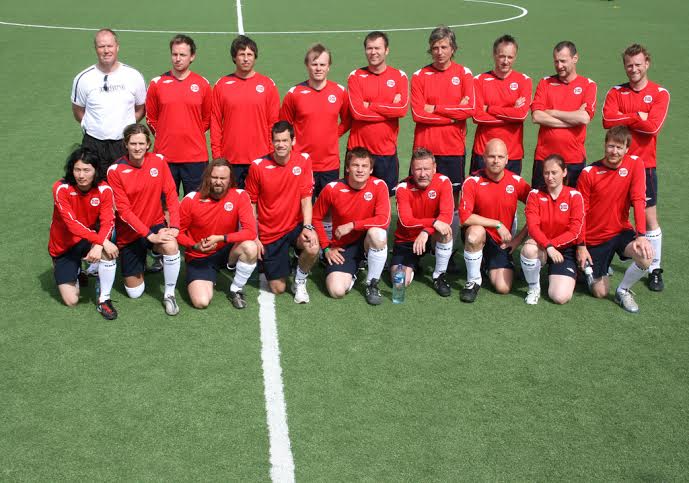 Norge – Tyskland 2010. Bak fra venstre: Jo Fenne, tysk målvakt, Eivind Evjemo, tysk lagleder, Stig Aasvik, tysk midtbanespiller, Johan Mjønes, tre tyskere, Jo Sannem, tysker, Eirik Ingebrigtsen, tysk stopper, Gunstein Bakke og Alf Kjetil Walgermo. Nede fra venstre: Thomas Marco Blatt, to tyskere, Tor Even Svanes, fire tyskere, Brynjulf Jung Tjønn, en tysk klassespiller, Aksel Selmer og Christian Valeur.
